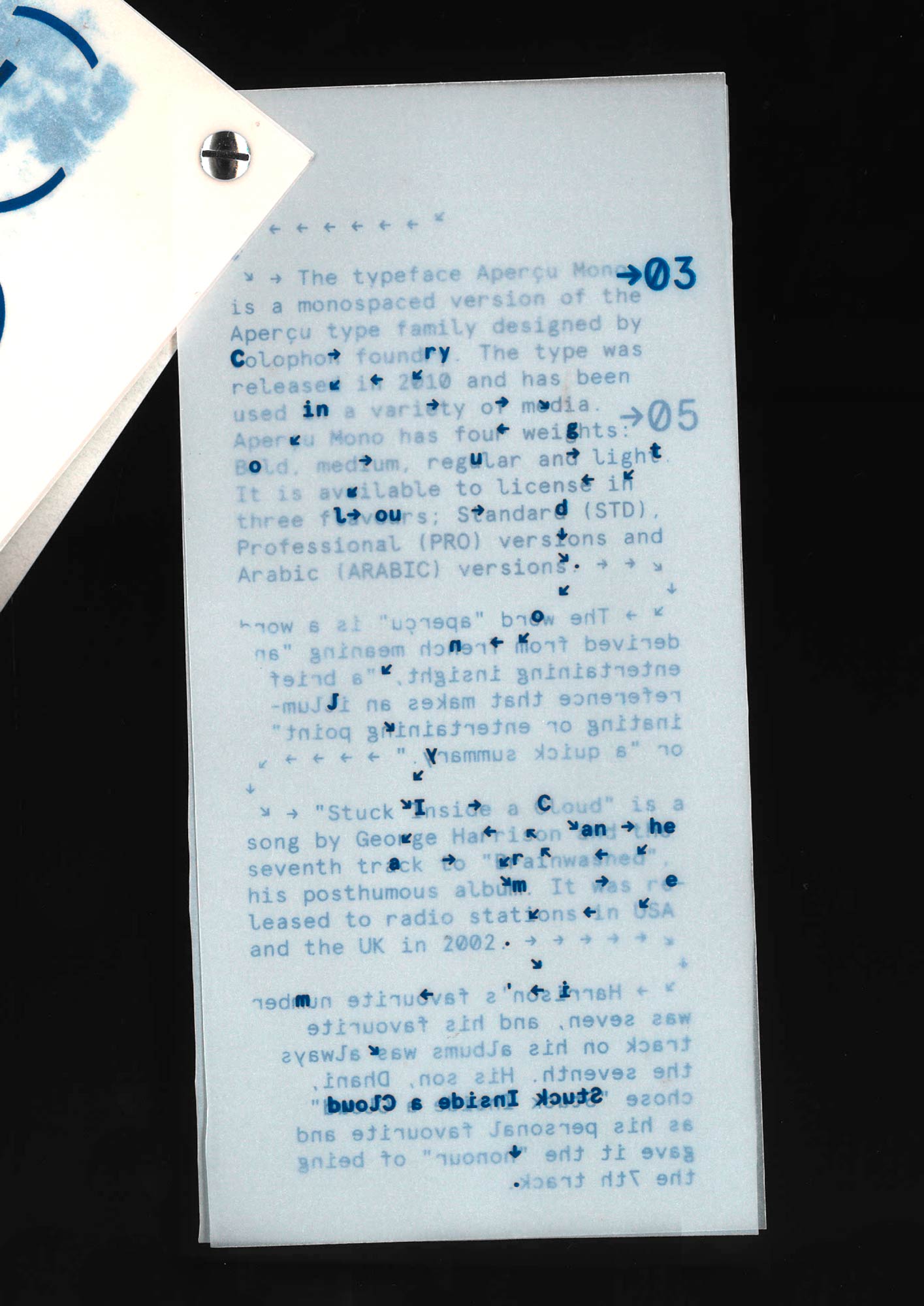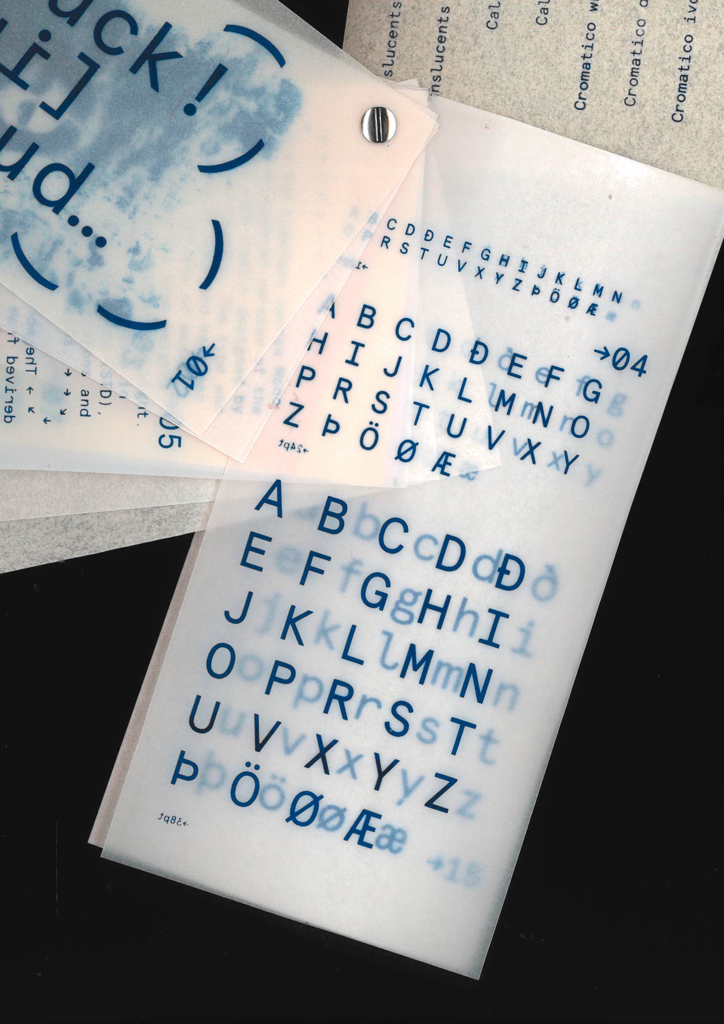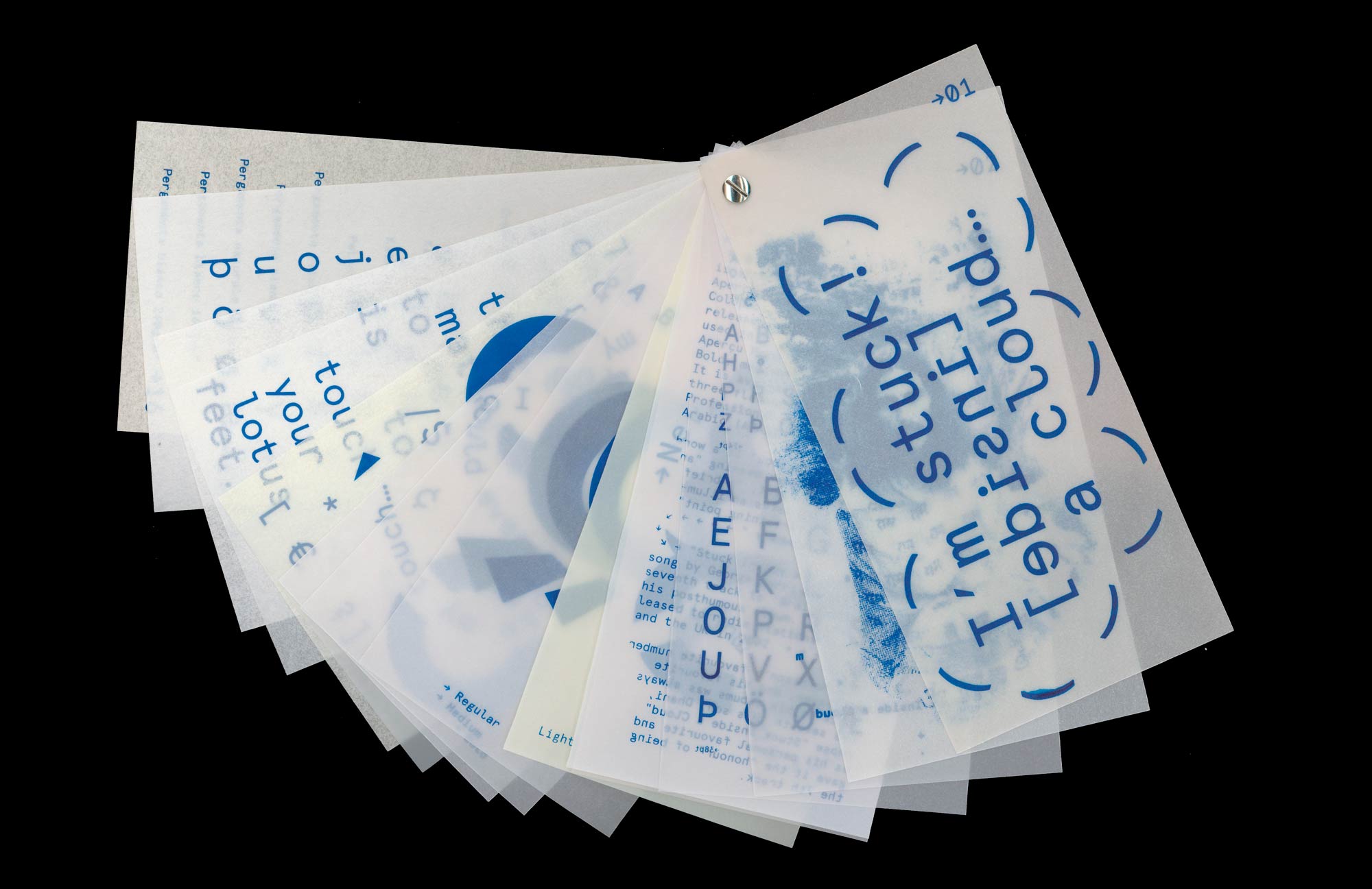 A specimen booklet showcasing sixteen different types of transparent paper, as well as the typeface Aperçu Mono by Colophon Foundry.